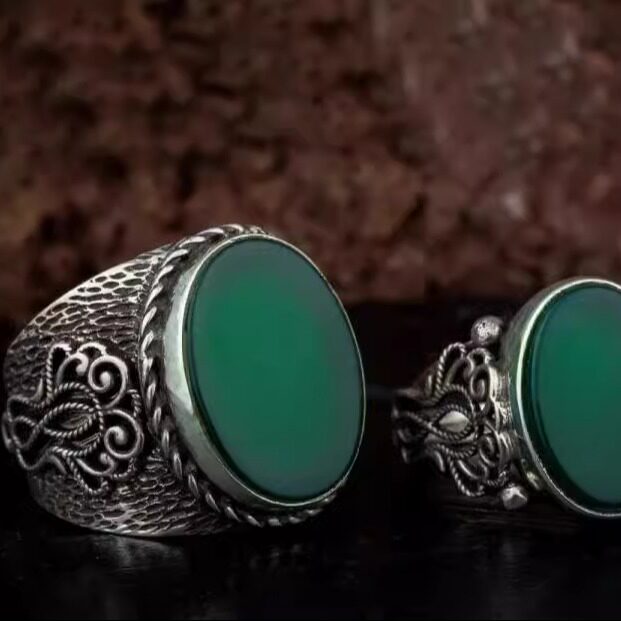 土耳其代购Jewelry㊣ 手作复古氧化纯银镶嵌绿玛瑙情侣戒指套装