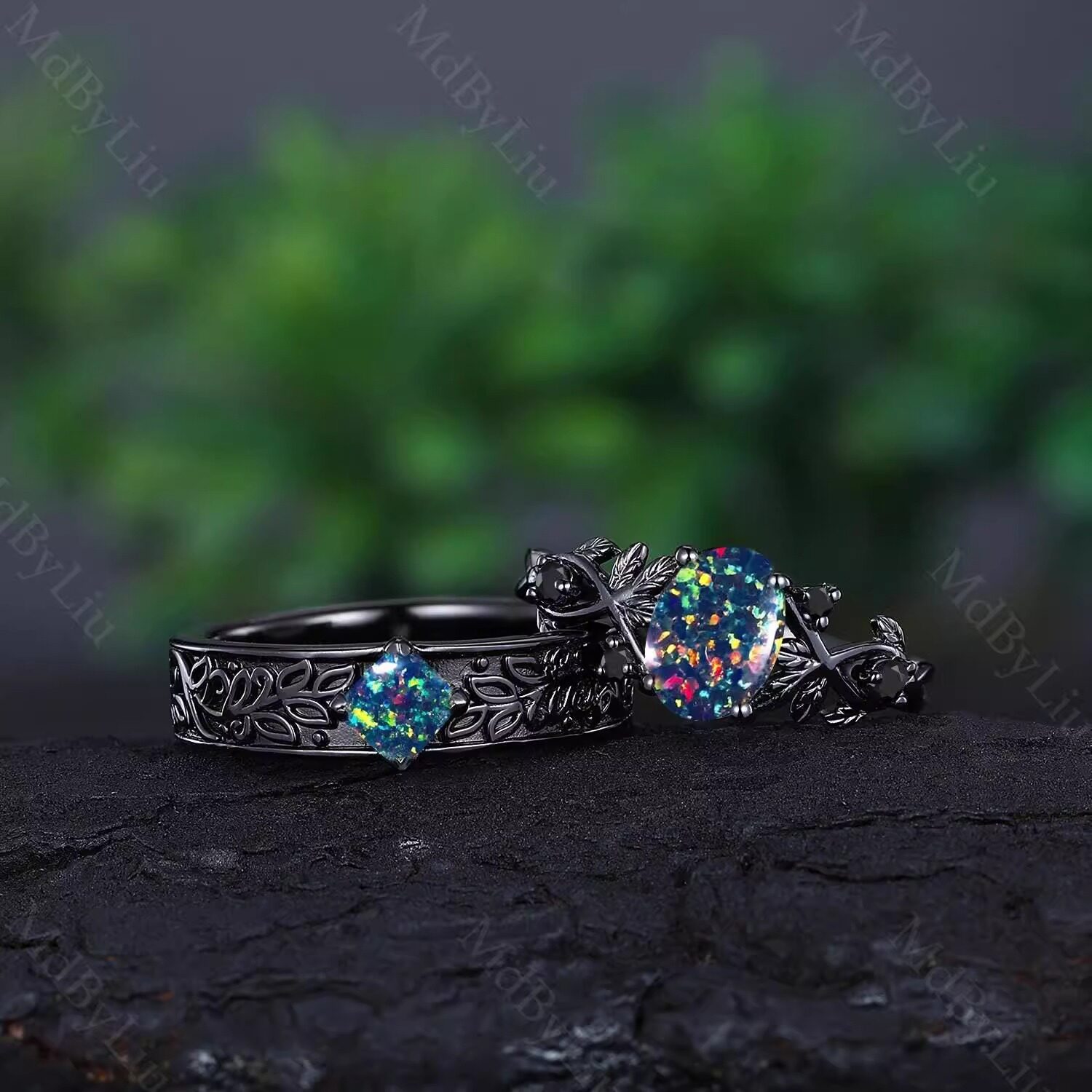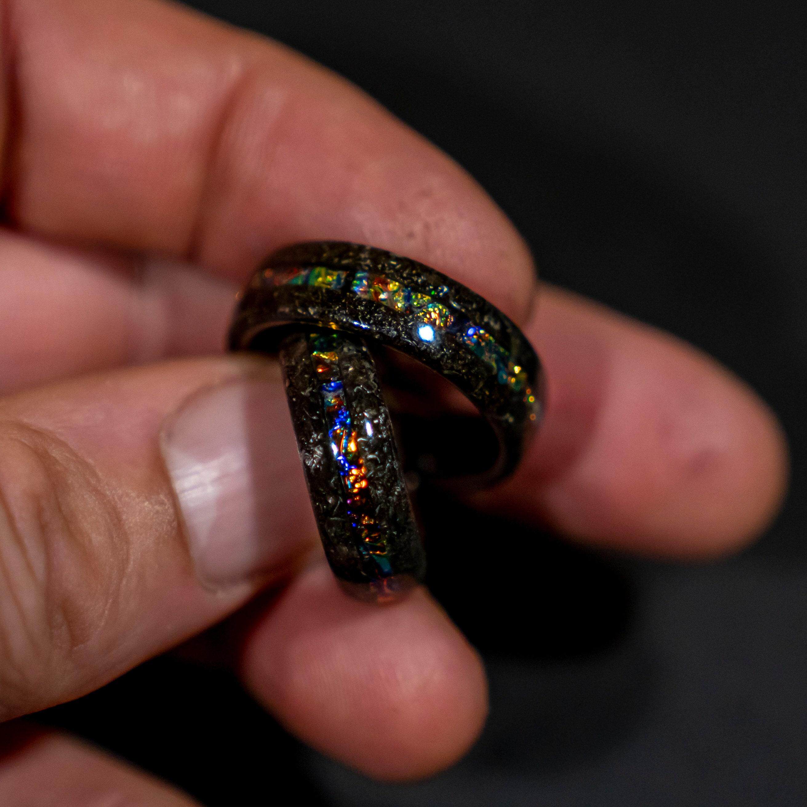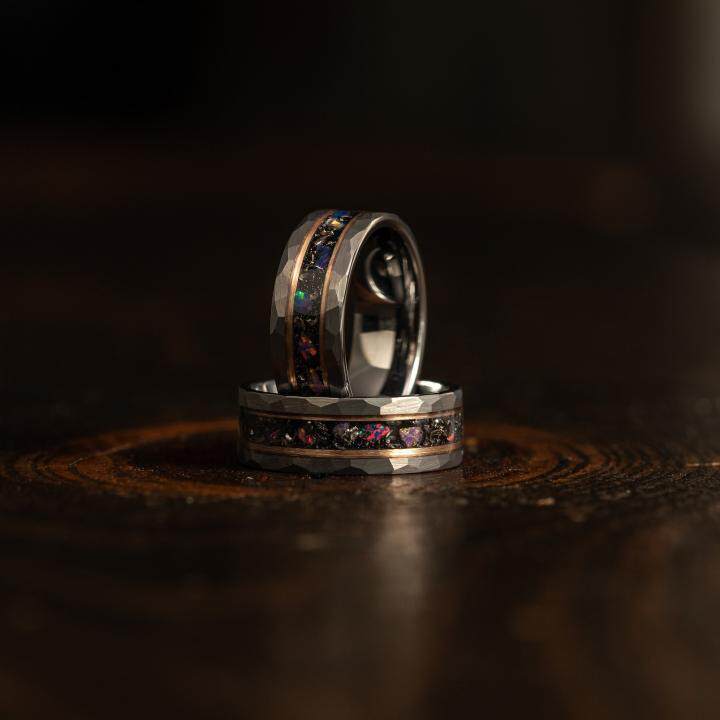 美国代购Opal◇手作陨石银河蛋白石黑色锤纹拉丝钨情侣结婚戒指