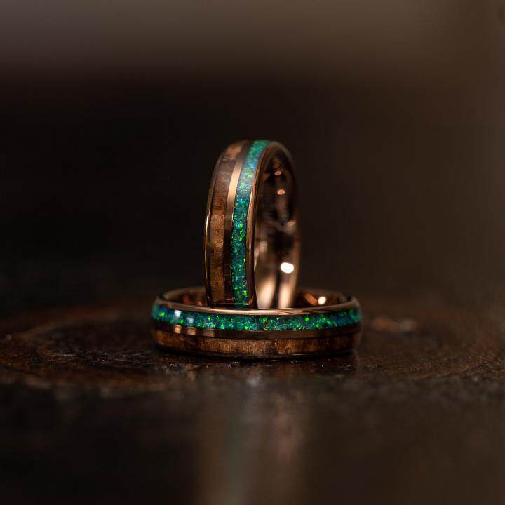 美国代购Opal◇手作华丽蛋白石镶嵌碳化钨玫瑰金结婚情侣对戒戒指