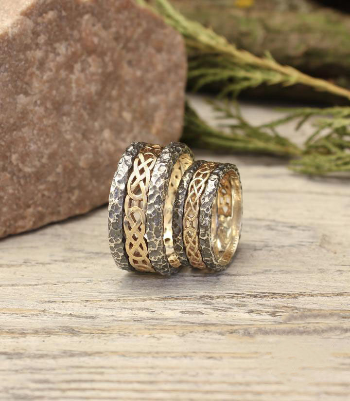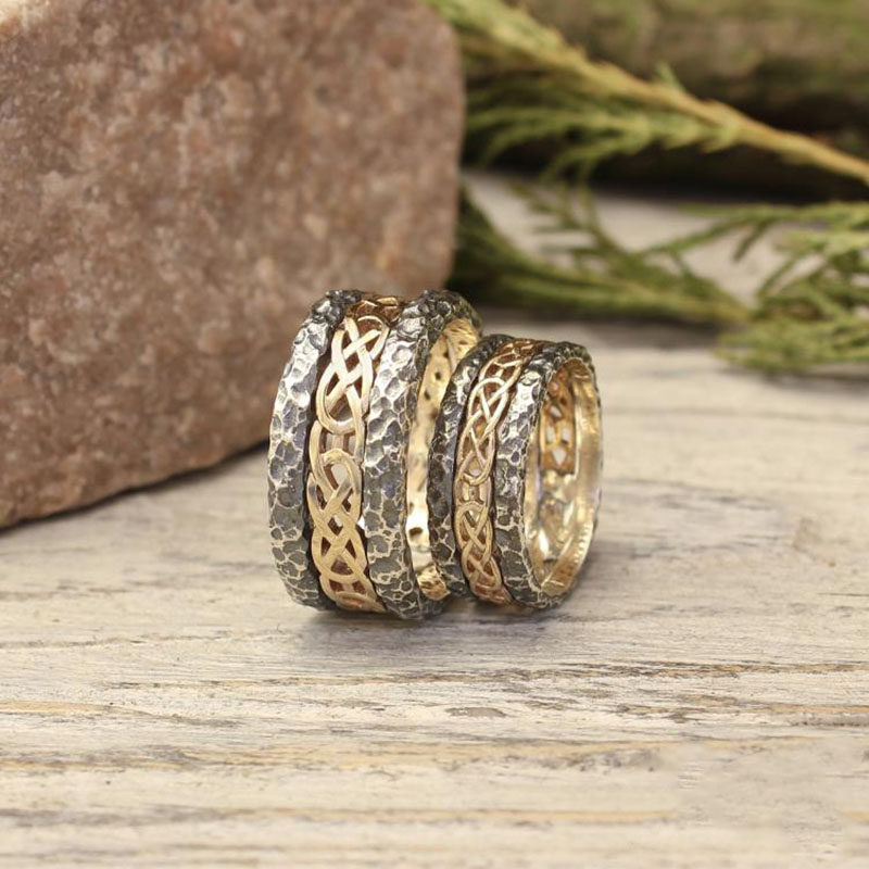 海外代购Set◇手作凯尔特结锤击纹理纯银14K黄金结婚对戒情侣戒指