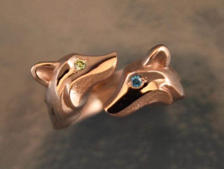 美国代购Fox◇手作复古双狐狸动物钻石点缀眼睛情侣结婚14K金戒指