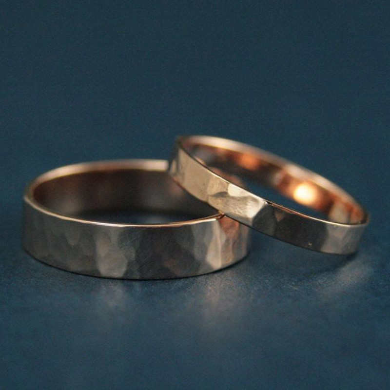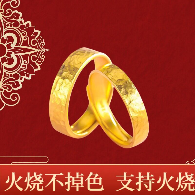 18k镀金色锤纹戒沙金戒指素圈情侣结婚对戒开口戒锤揲火烧不掉色