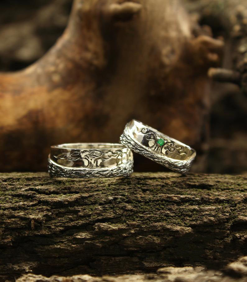 乌克兰代购Tree◇手作自然树枝花朵祖母绿镶嵌情侣对戒结婚戒指