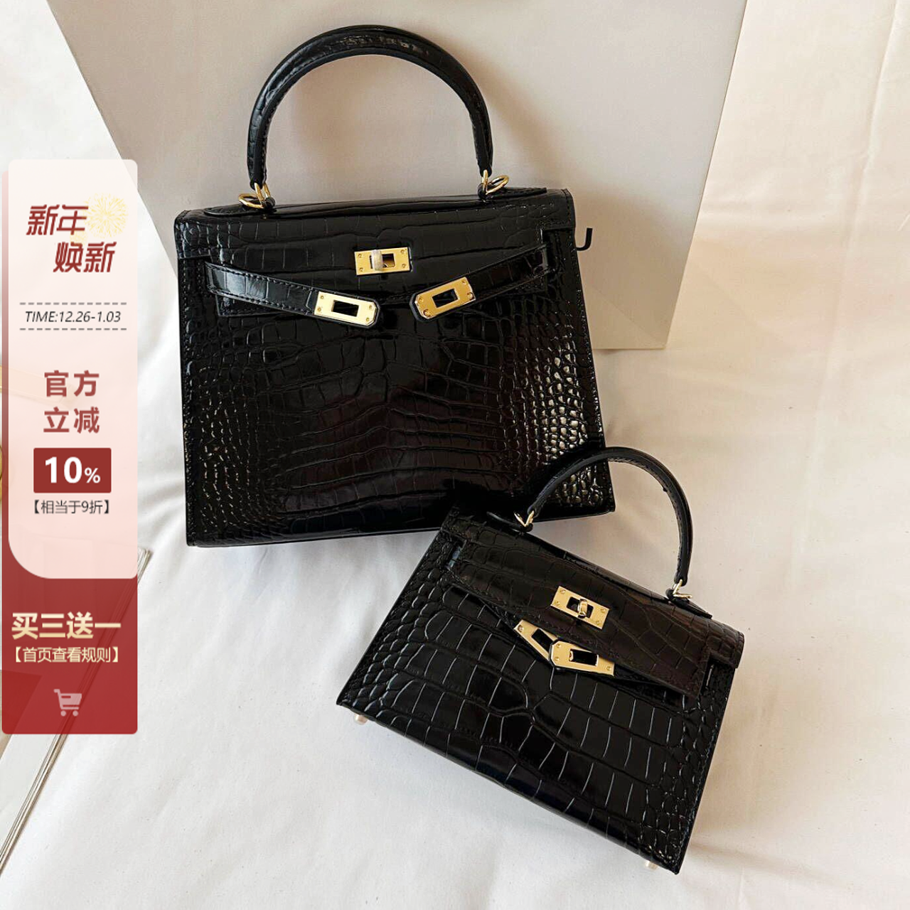 真皮一代手提凯莉包女高级质感黑色鳄鱼纹包包秋冬新款单肩斜挎包