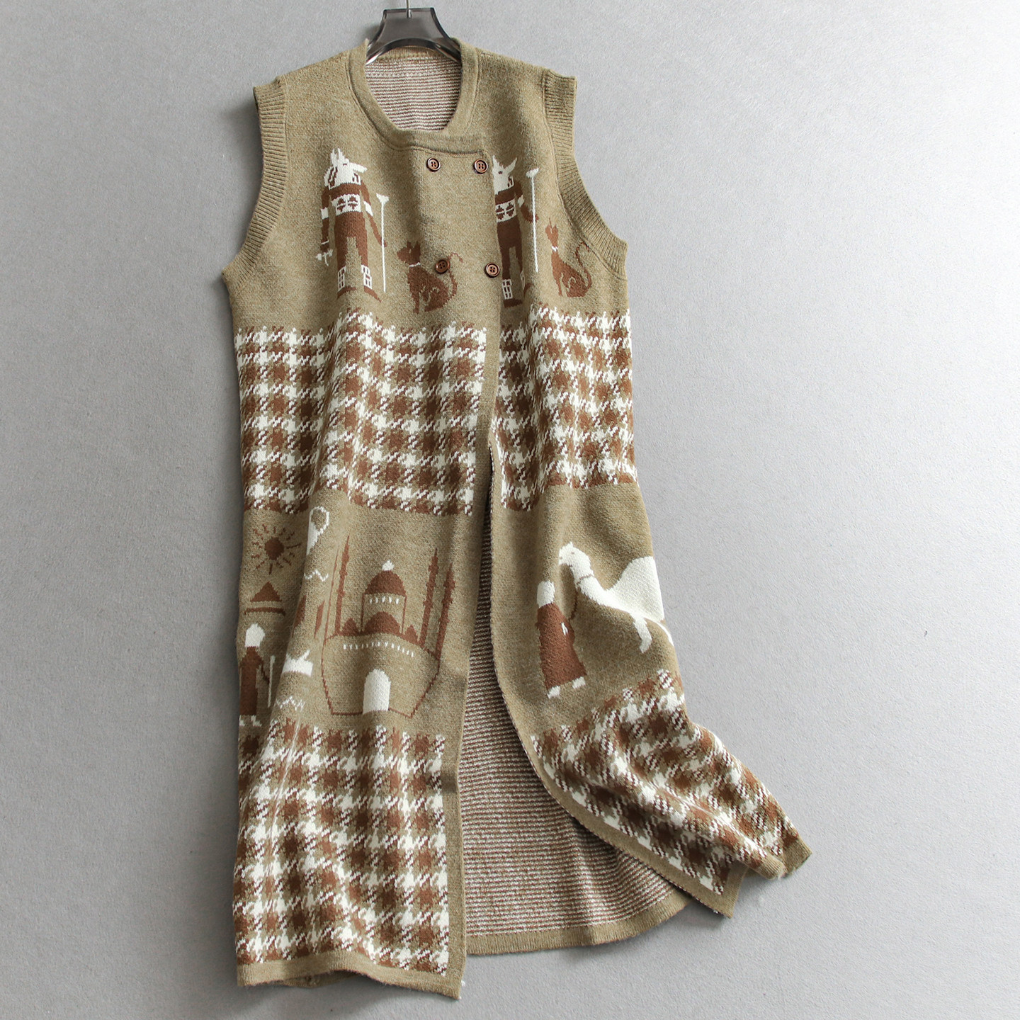 趣味动物提花双排扣圆领无袖长款无袖针织背心毛衣外套女马夹Q289
