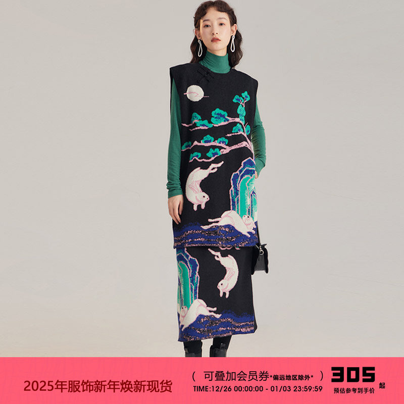 有耳uare原创设计师 月下兔 新中式国风针织背心马甲毛衣裙中长款