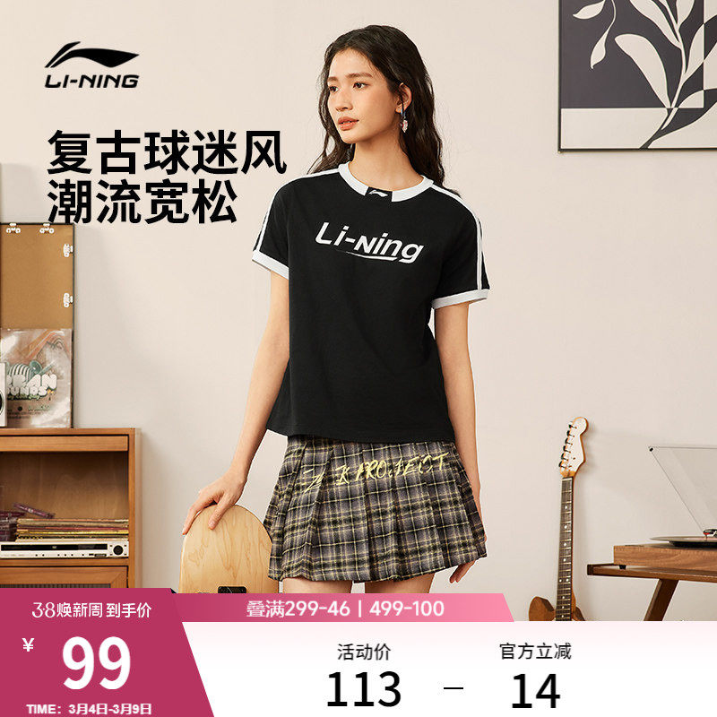 李宁短袖女士春夏黑色上衣圆领女装透气休闲复古半袖运动正肩T恤