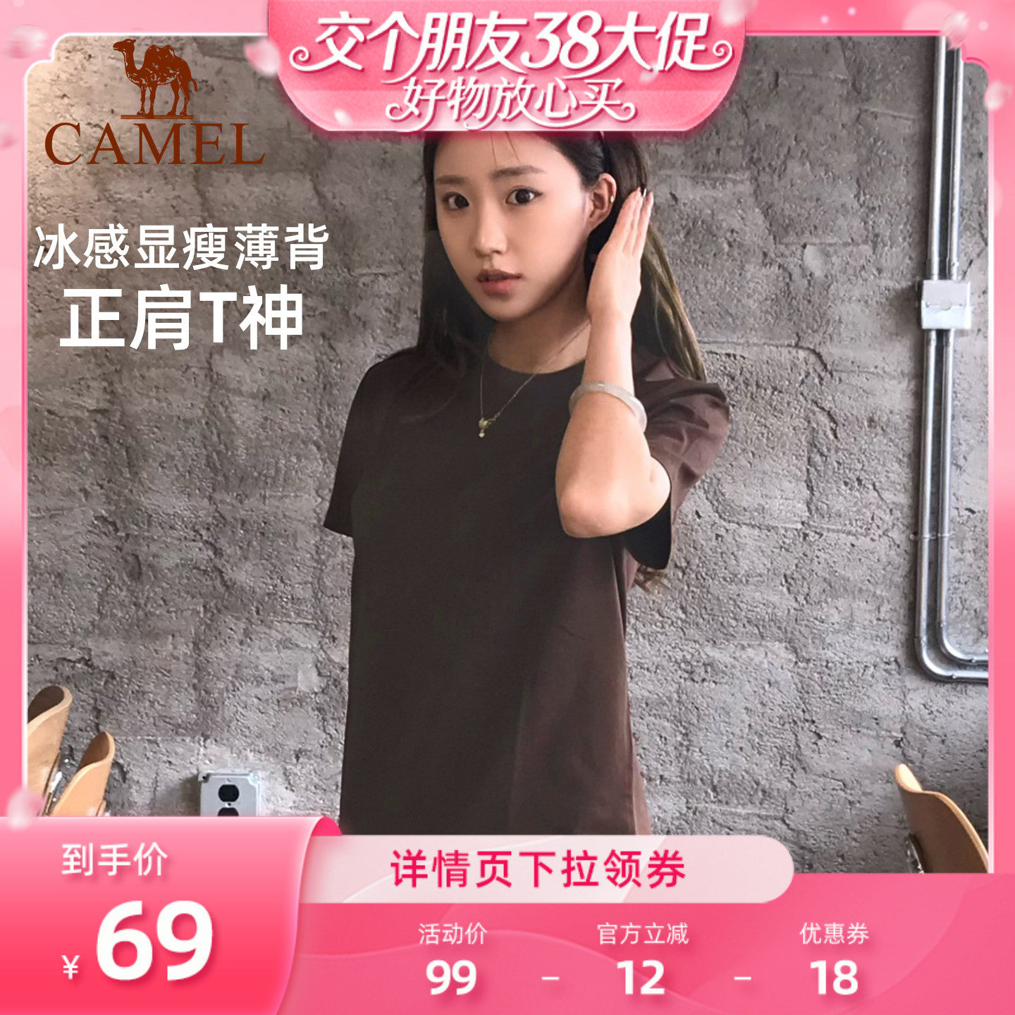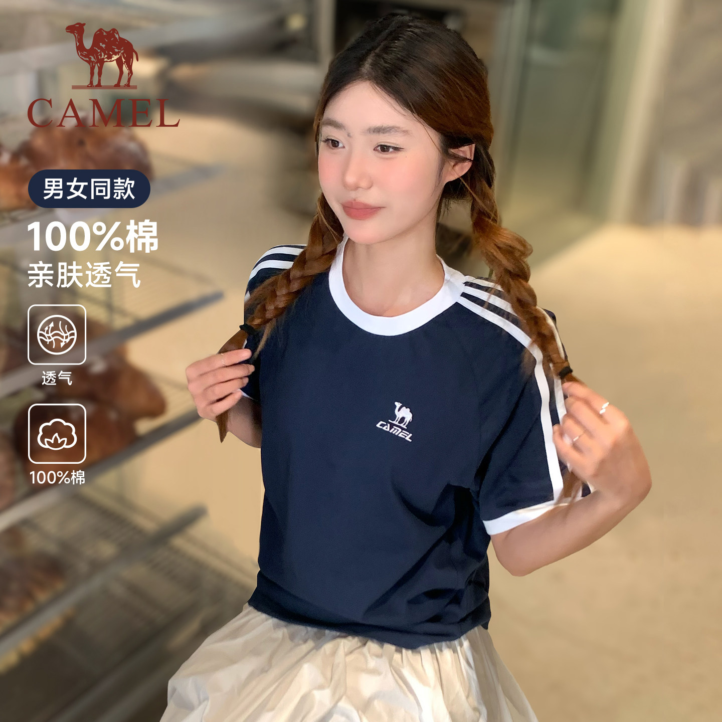 [迪丽热巴同款]骆驼柔棉T神春夏季T恤短袖女情侣宽松休闲上衣男