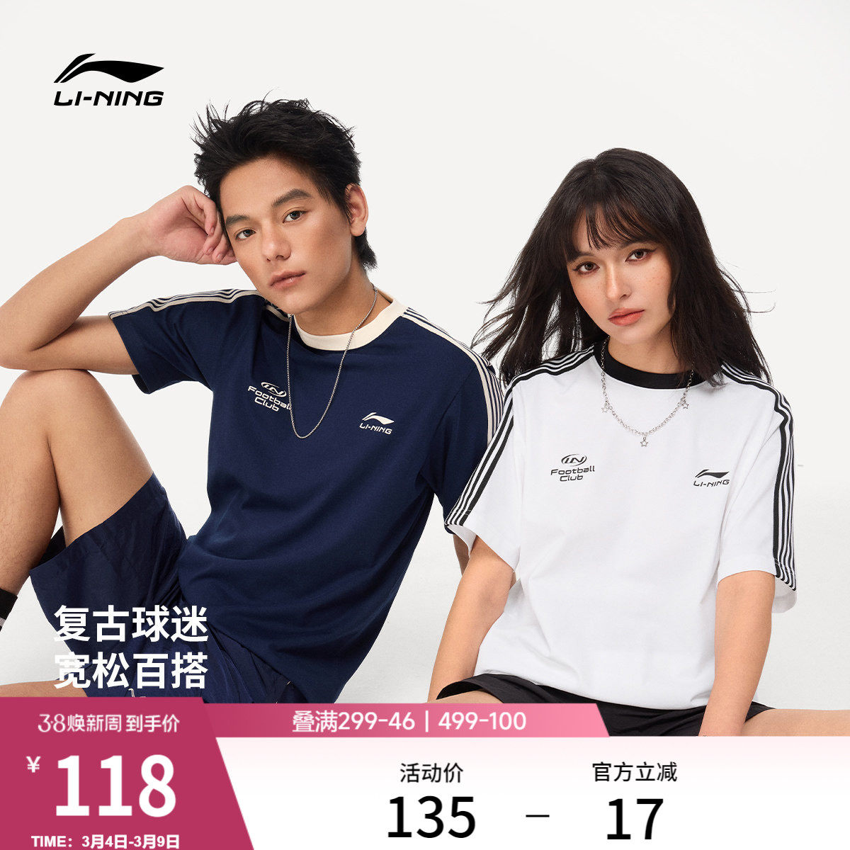 李宁球迷风短袖女春夏2026新款情侣透气上衣圆领宽松针织运动T恤