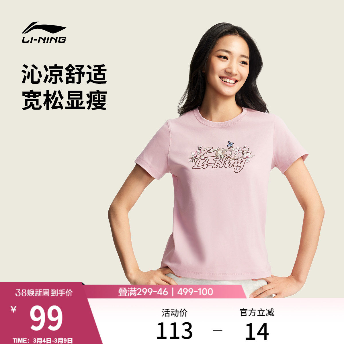 李宁甜美风短袖女春夏2026新款女装凉感圆领上衣休闲宽松运动T恤