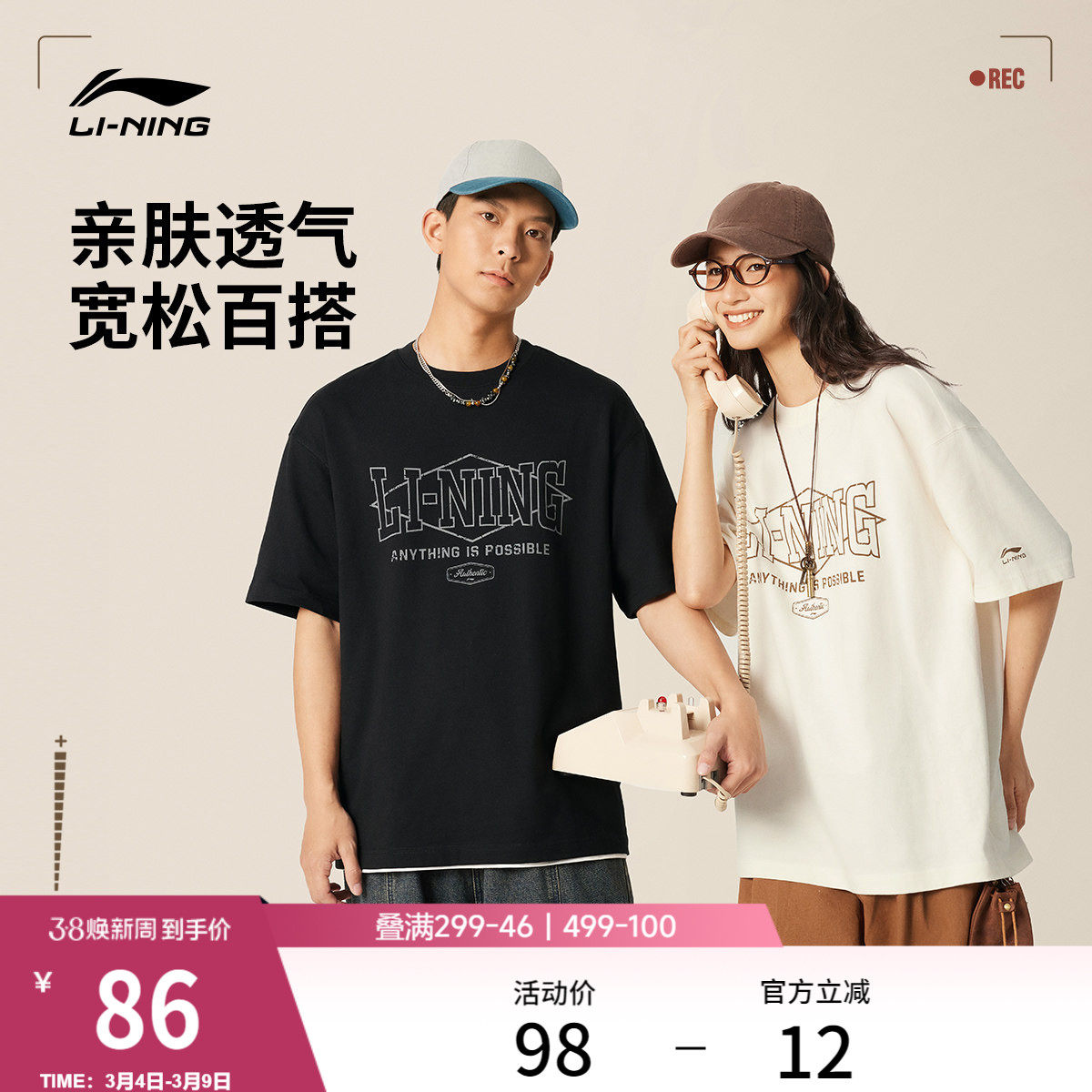 李宁短袖女春夏情侣圆领体恤美式复古宽松白色上衣男纯棉运动T恤