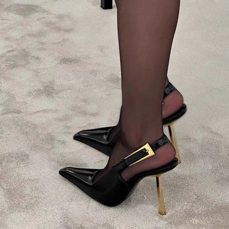 黑色尖头高跟鞋细跟2025新款娜扎同款气质漆皮性感金属包头凉鞋女
