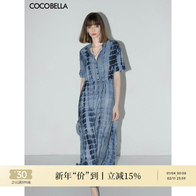 COCOBELLA手工扎染印花衬衫裙女夏气质通勤OL束腰连衣裙FR525