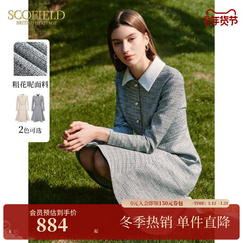 【小香风】Scofield女装OL通勤中长连衣裙翻领粗花呢春季裙子