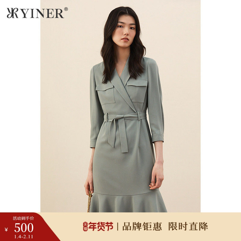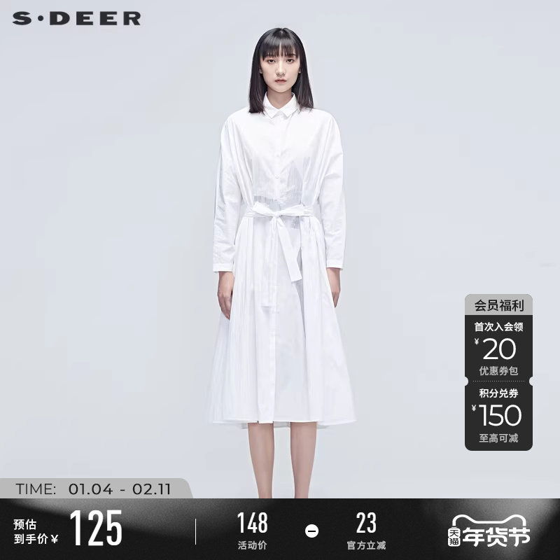 sdeer圣迪奥春秋简约优雅翻领收腰显瘦通勤OL连衣裙女S20381215