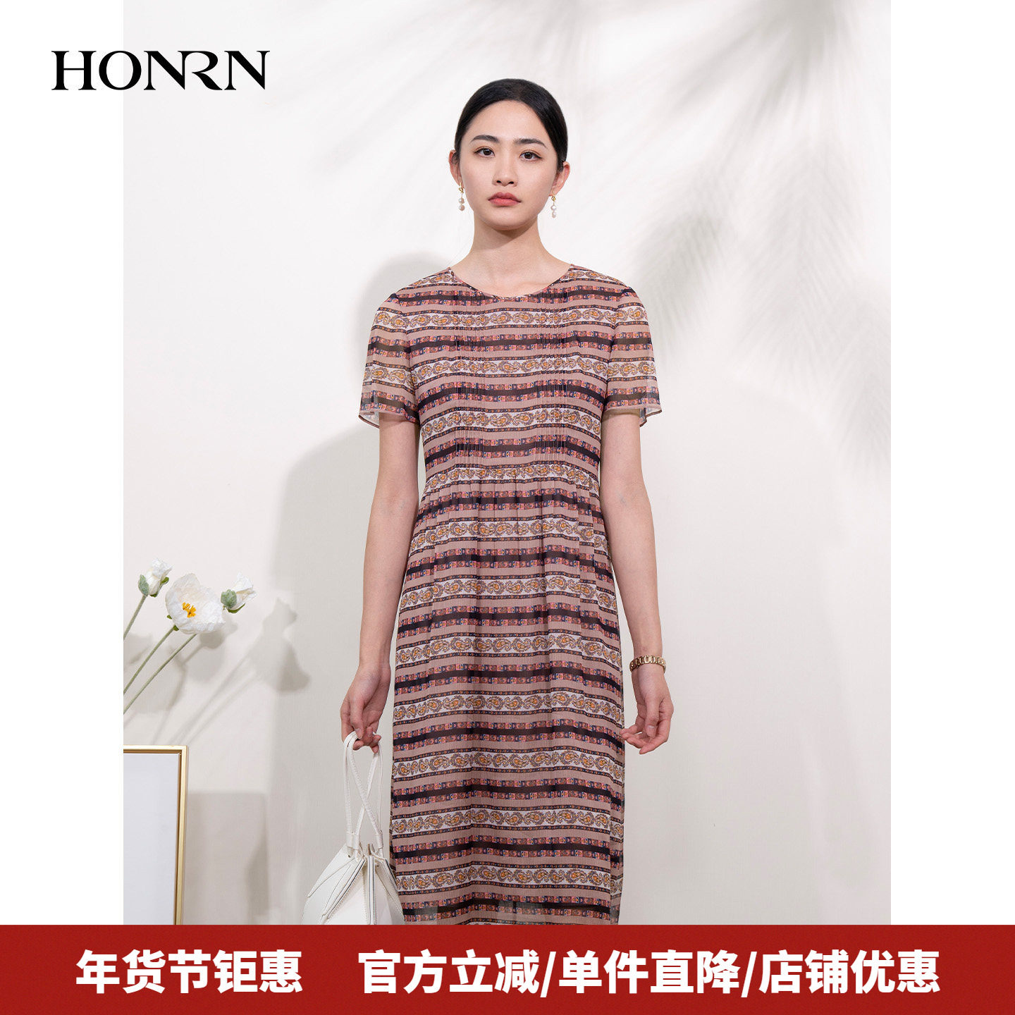 HONRN/红人民族风收腰显瘦条纹印花圆领短袖连衣裙女夏HI22OL765