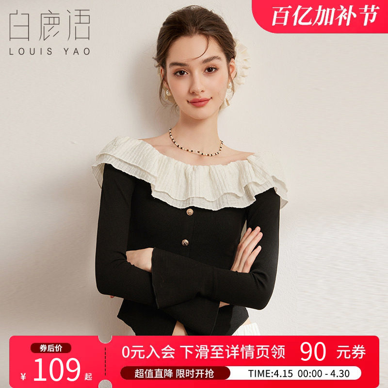 白鹿语撞色木耳边一字肩衬衣 2026春秋气质修身喇叭长袖衬衫女