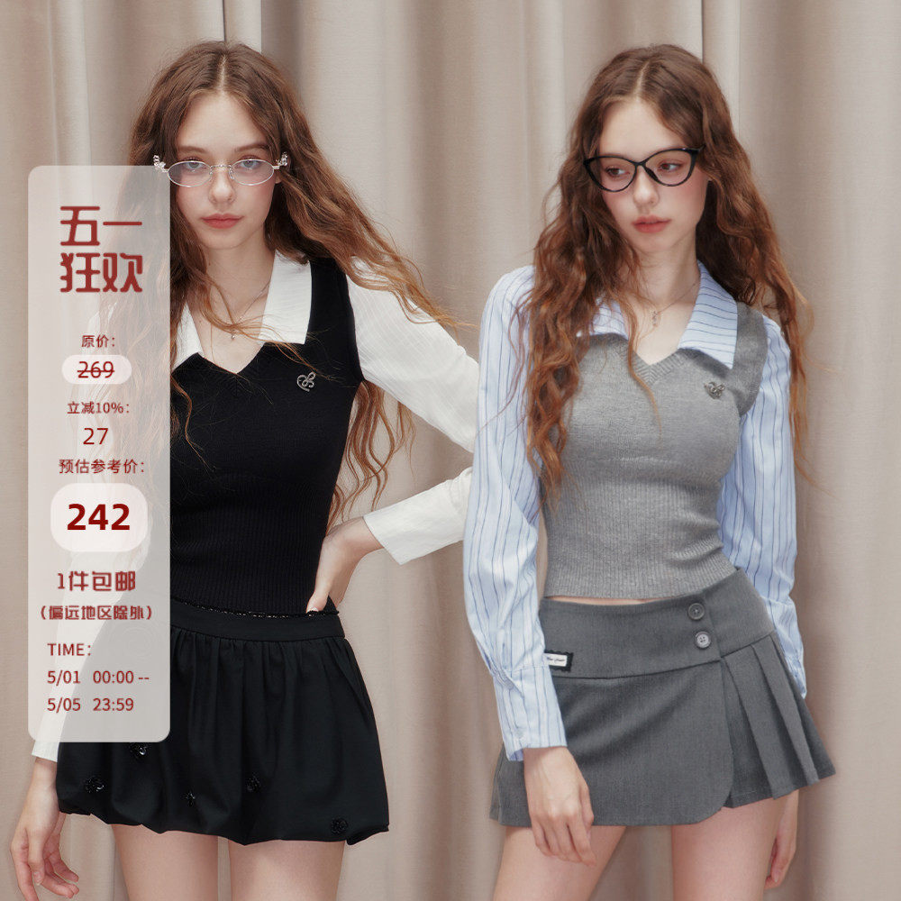 Mess Studio 辣妹毛织拼接衬衣修身条纹假两件上衣长袖衬衫女短款