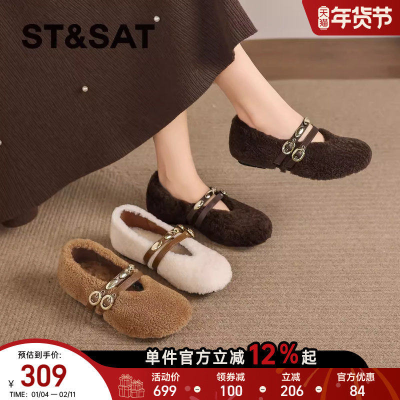 星期六羊毛加绒毛毛鞋玛丽珍鞋女2025秋冬新款百搭平底一字扣单鞋