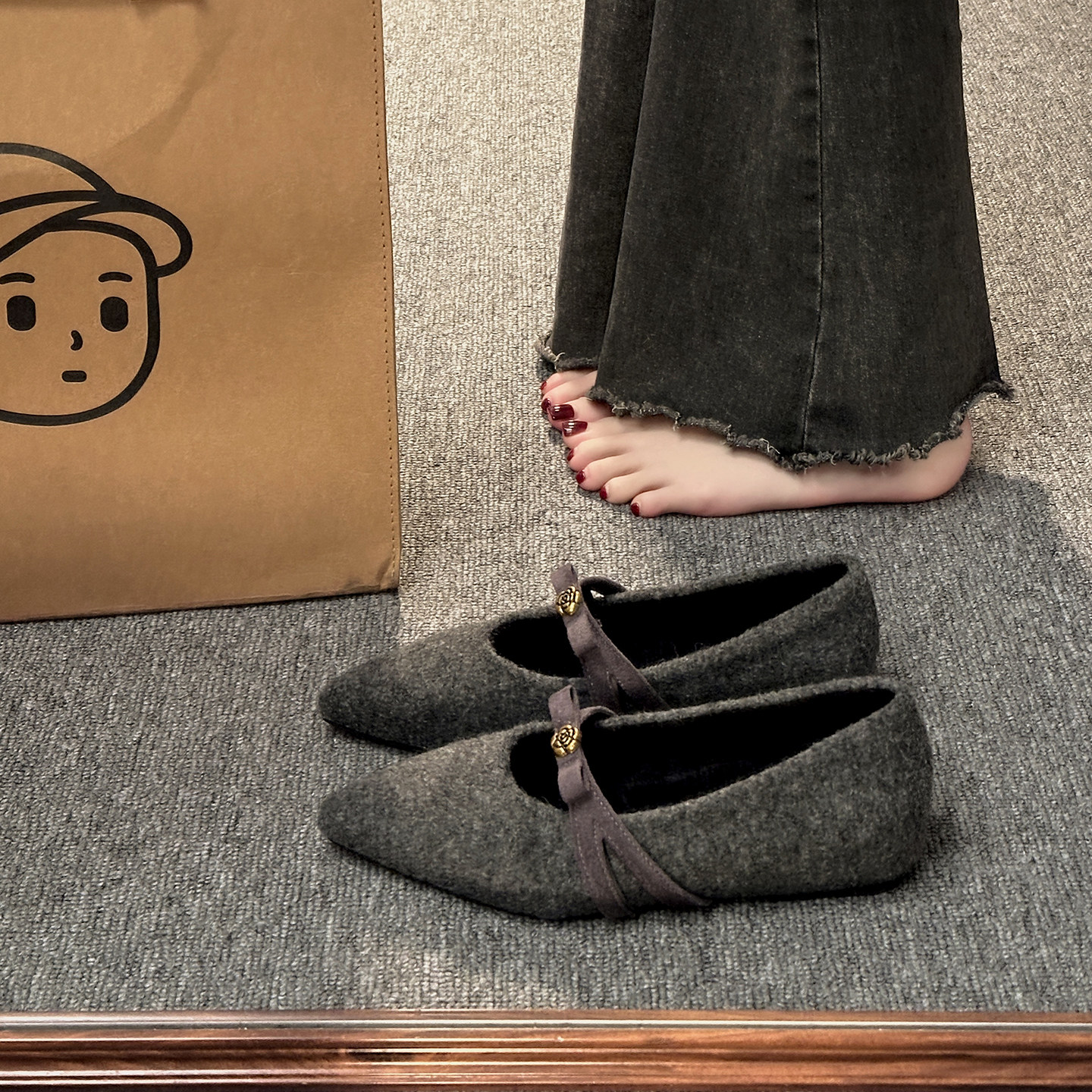 秋冬凹造型女鞋2025新品毛呢玛丽珍软平底单鞋灰色毛毛鞋金属扣带
