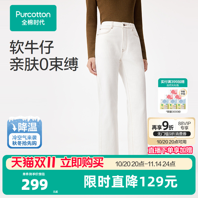 【100%棉】POLOWALK白色牛仔裤女士秋冬新品百搭阔腿裤显瘦长裤子