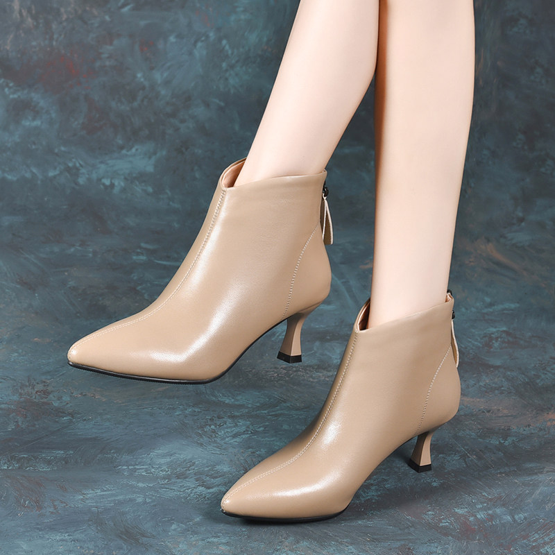 2025新款小跟高跟鞋秋冬季真皮小短靴尖头细跟裸靴女及踝春秋单靴