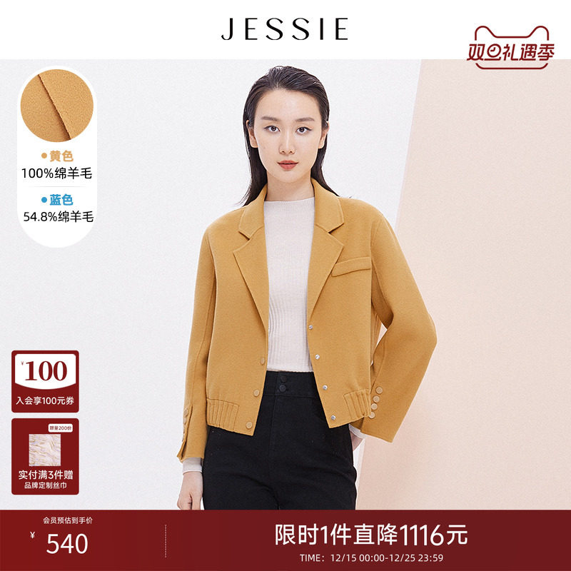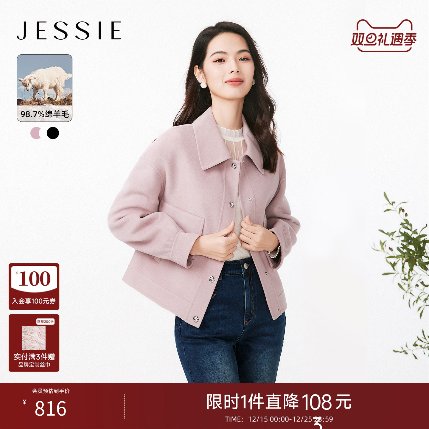 【商场同款】JESSIE翻驳领100%绵羊毛短款毛呢外套秋装气质长袖款