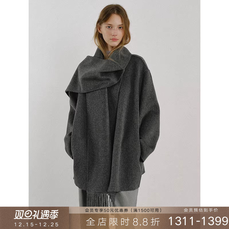 popchrio◆流苏围巾领高支羊毛双面呢大衣小个子短款毛呢外套女冬