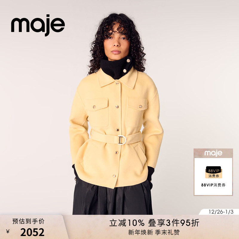 Maje2025春夏女装法式时尚羊毛混纺黄色系带收腰翻领短款毛呢外套