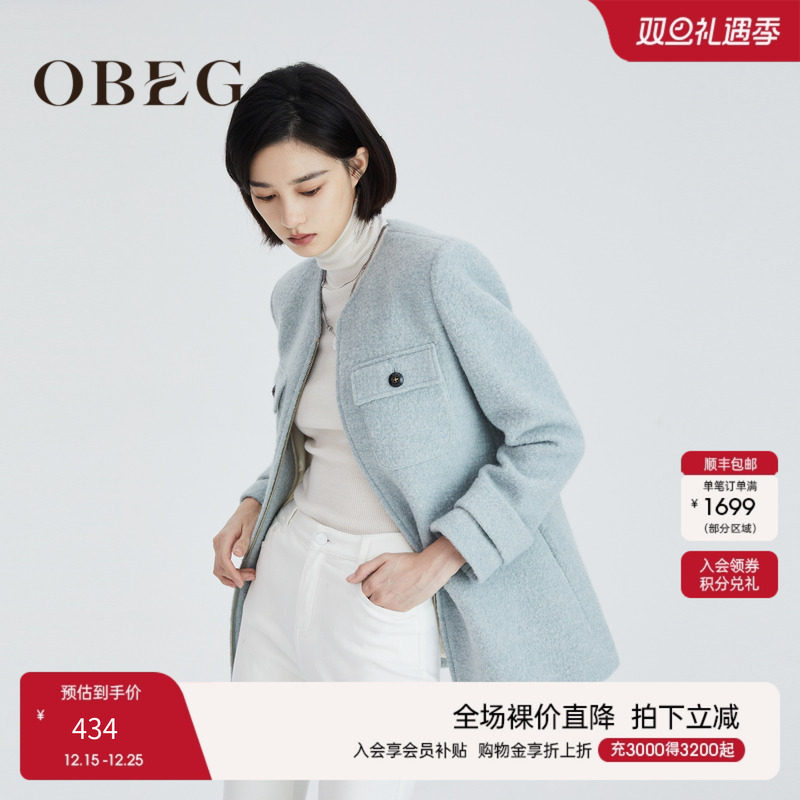 OBEG欧碧倩简洁修身短款毛呢外套冬小V领通勤上衣10424021
