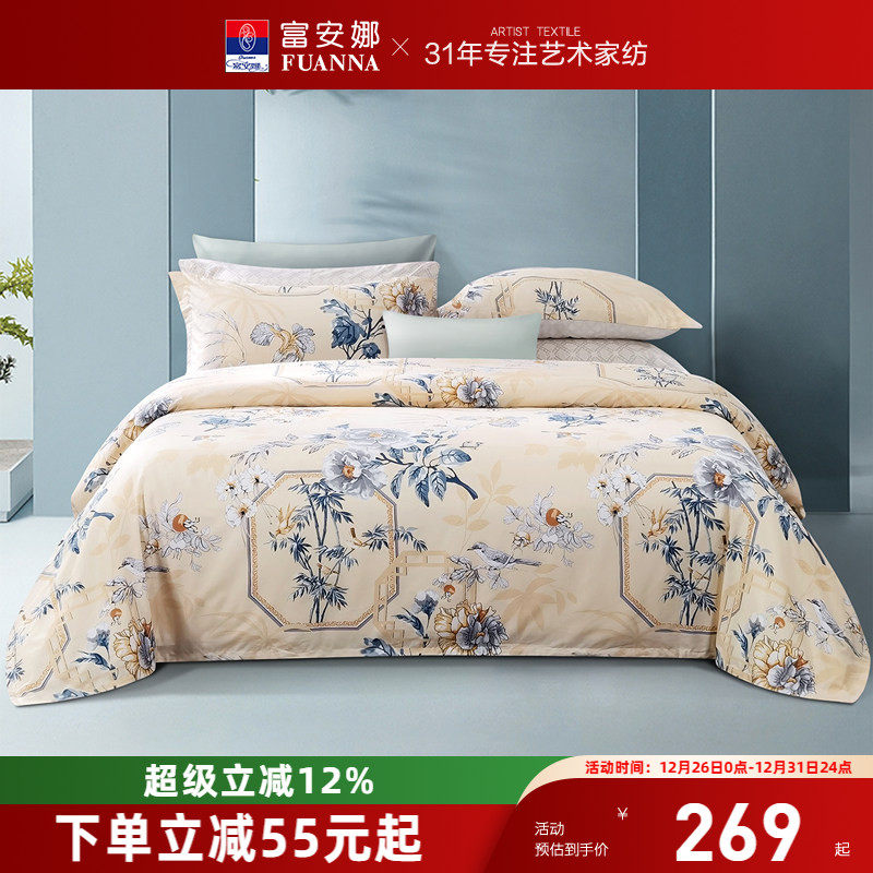 富安娜60支长绒棉纯棉床单四件套全棉被套轻奢高级感套件床上用品