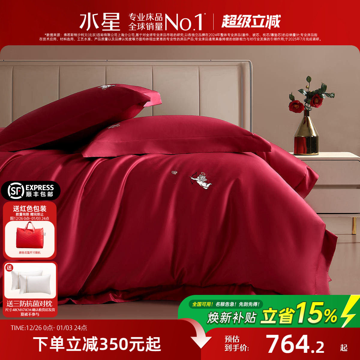水星家纺100S长绒棉婚庆四件套全棉轻奢高端大红结婚套件纯棉被套