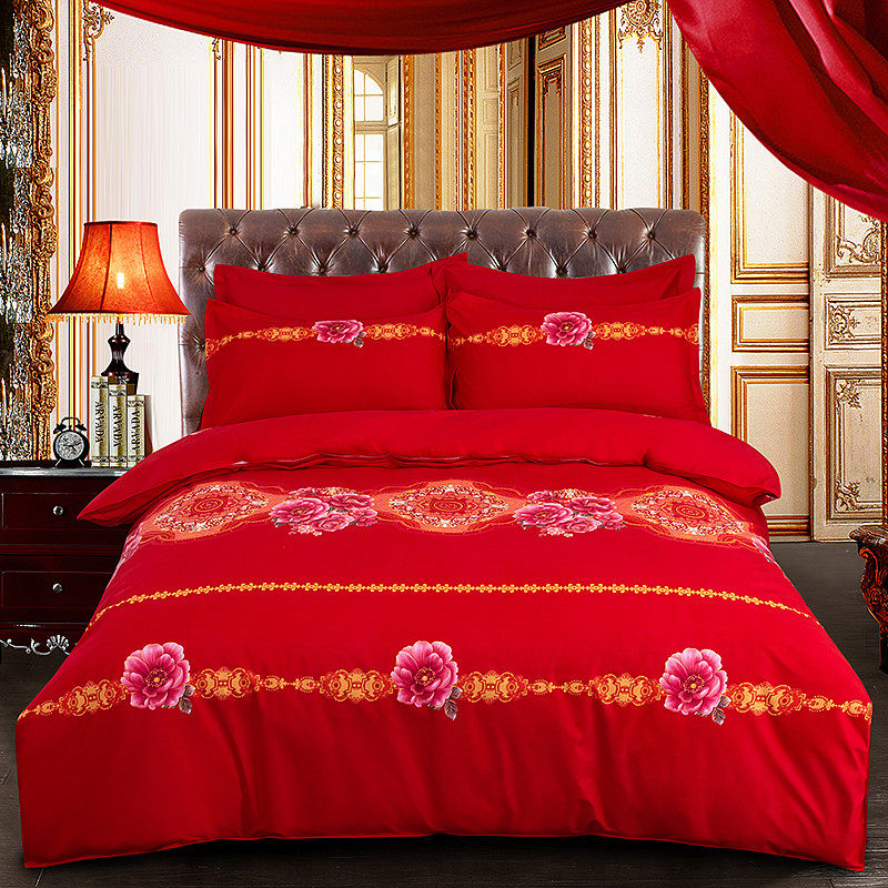 水星家纺大红色婚庆四件套60s全棉床上用品套件纯棉被套床单婚嫁