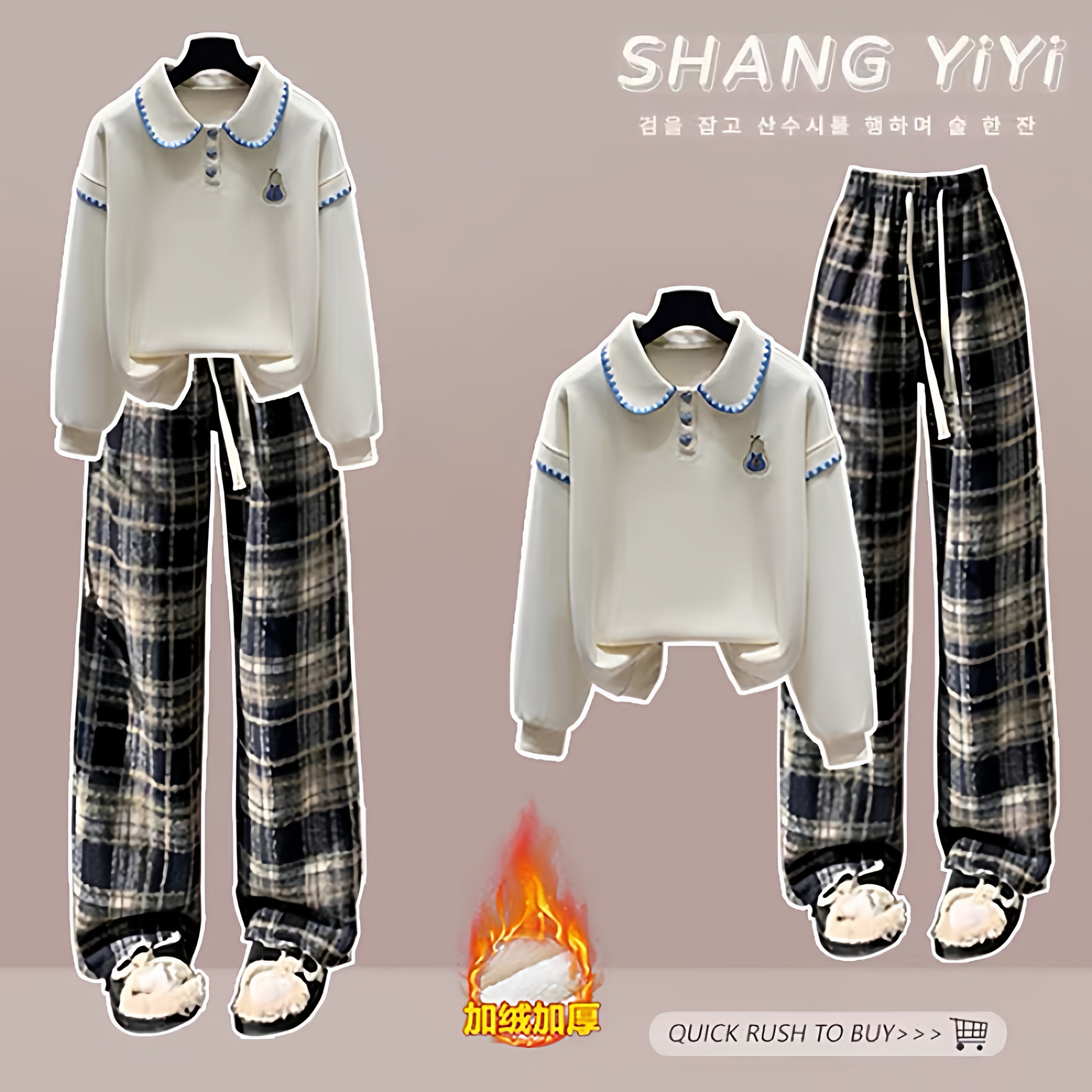 女大童加绒卫衣套装2025秋冬季韩版初中生休闲加厚格子裤两件套潮