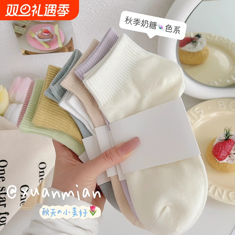 糖果色女袜中筒纯棉无骨吸汗透气精梳棉袜子短袜彩色清新马卡龙色