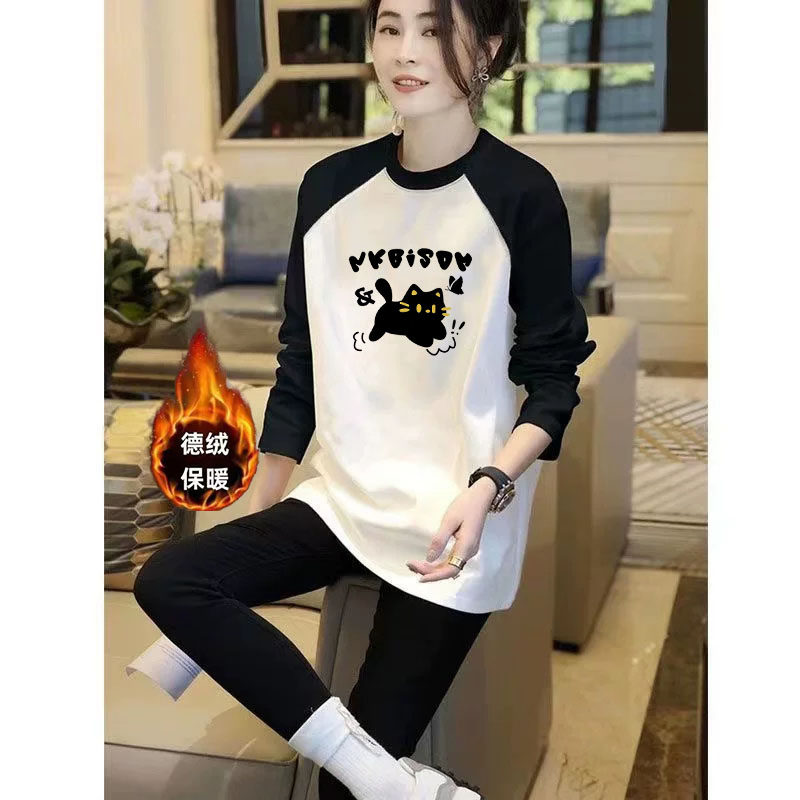 德绒保暖撞色插肩2025秋冬新款长袖打底衫宽松中长款T恤上衣女ins
