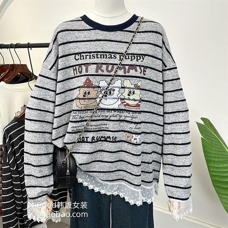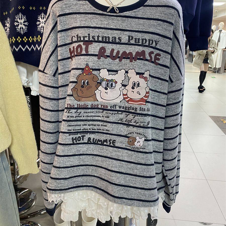 2025春季新款韩版减龄百搭条纹卡通蕾丝花边宽松中长款t恤女长袖