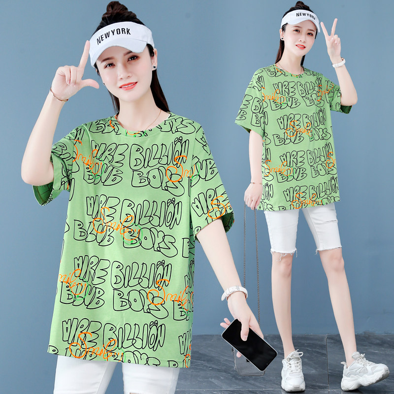 大码V领简约显瘦短袖上衣女300斤胖MM个性字母印花宽松中长款T恤