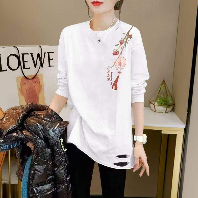 潮流纯棉白色打底外穿破洞长袖宽松中长款T恤显瘦大码新款上衣ins