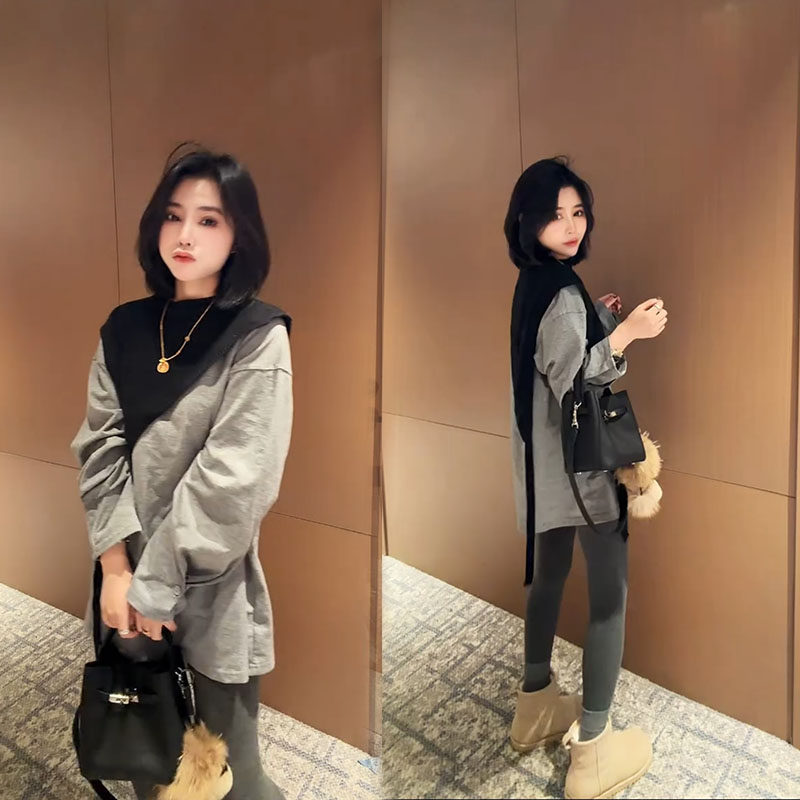 十三行里安20829冬季新款休闲宽松中长款T恤上衣+针织披肩两件套