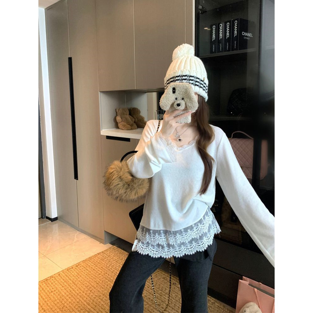 蕾丝拼接长袖V领打底衫女2025秋冬新款时尚宽松中长款T恤内搭上衣