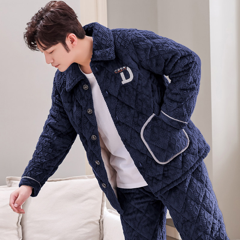 男士睡衣冬季珊瑚绒加厚加绒青年三层夹棉袄秋冬款保暖法兰家居服