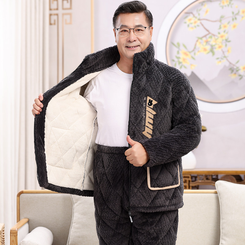 睡衣男士冬季加厚加绒珊瑚绒夹棉三层保暖中老年人爸爸家居服套装