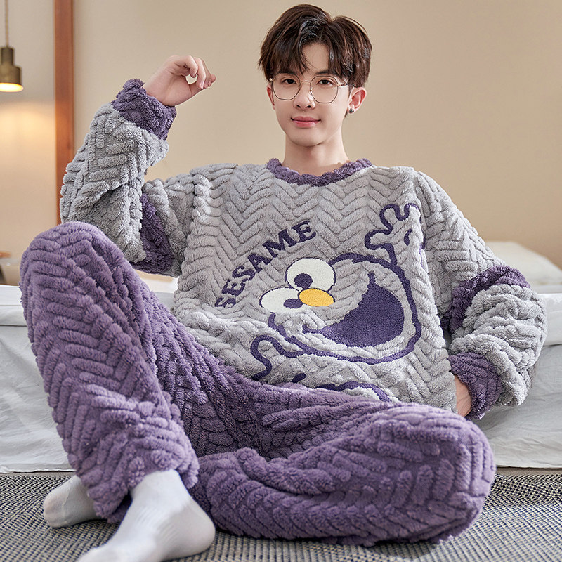 男士睡衣冬季珊瑚绒加厚加绒圆领套头大码卡通青少年法兰绒家居服