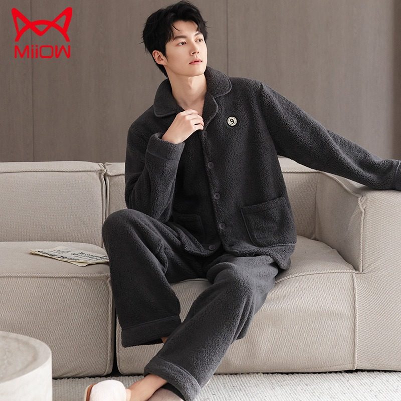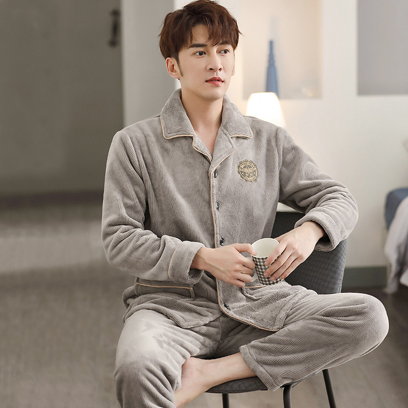 男士睡衣冬季珊瑚绒加厚加绒法兰绒秋冬新款可外穿开衫家居服套装