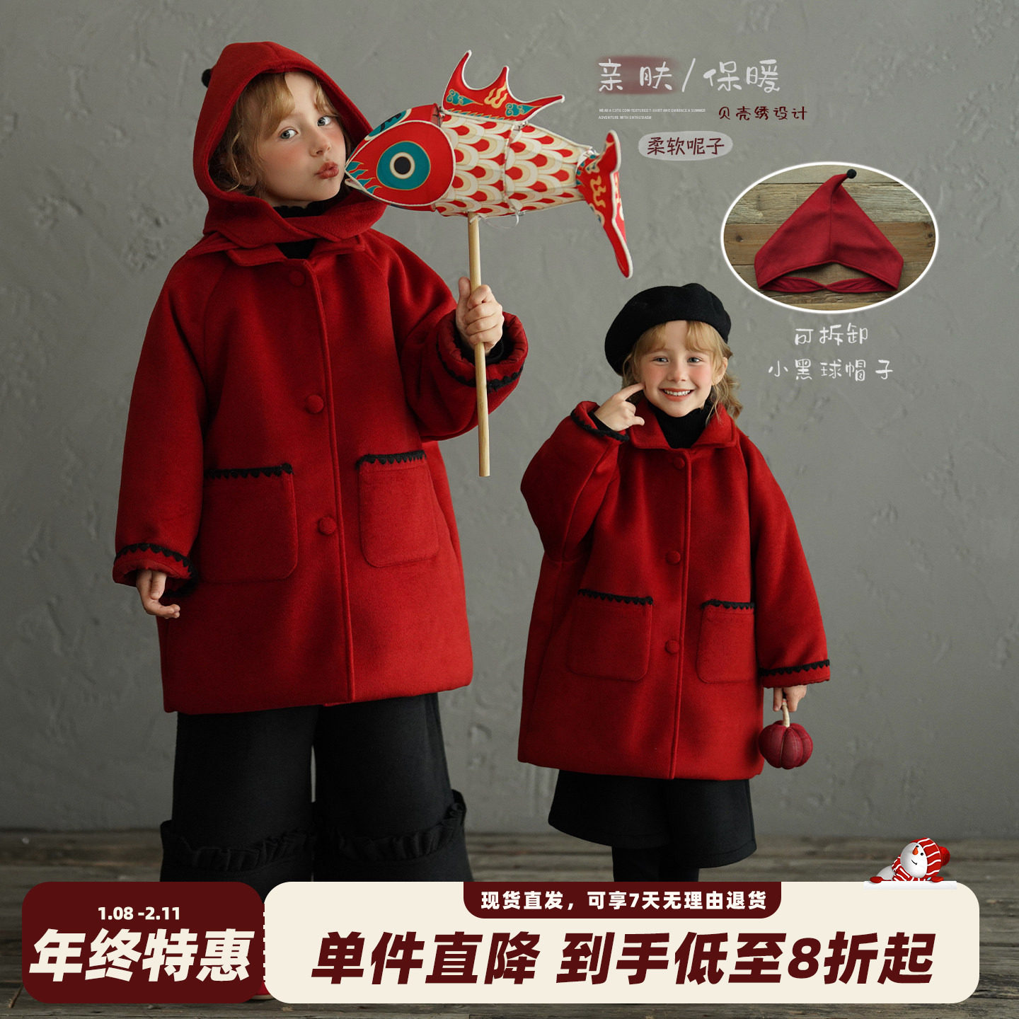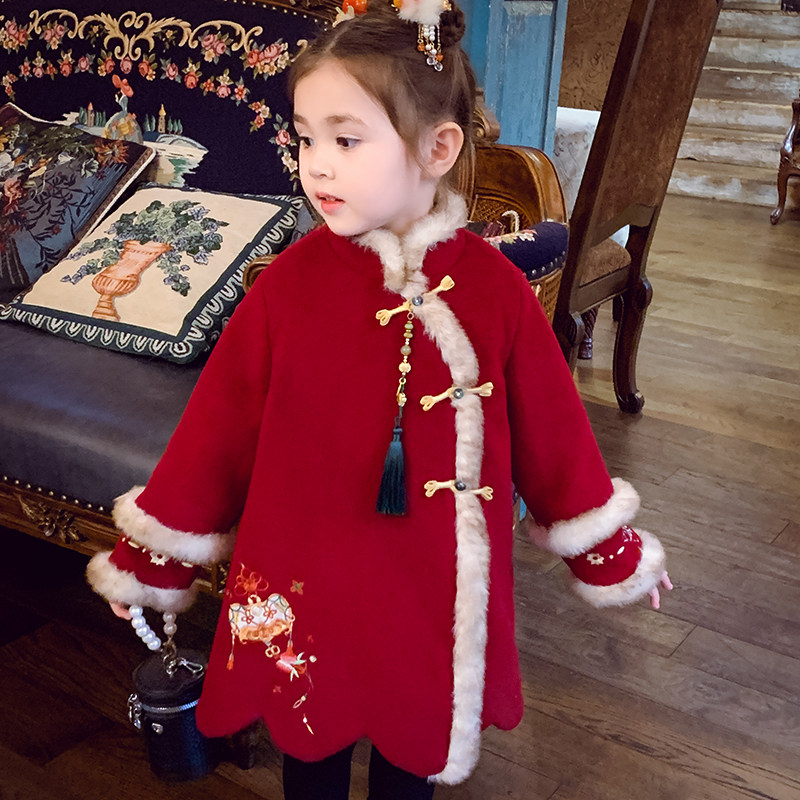 砚台家女童毛呢大衣红色中长款夹棉冬装新款宝宝新年加厚保暖外套