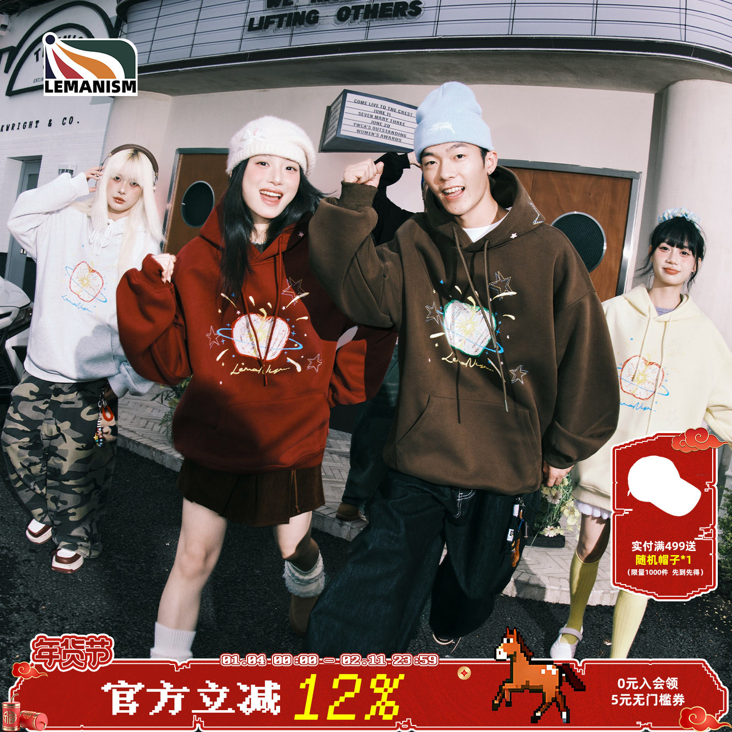 lemanism美式潮流涂鸦苹果加绒连帽卫衣男2025春秋季新款情侣款