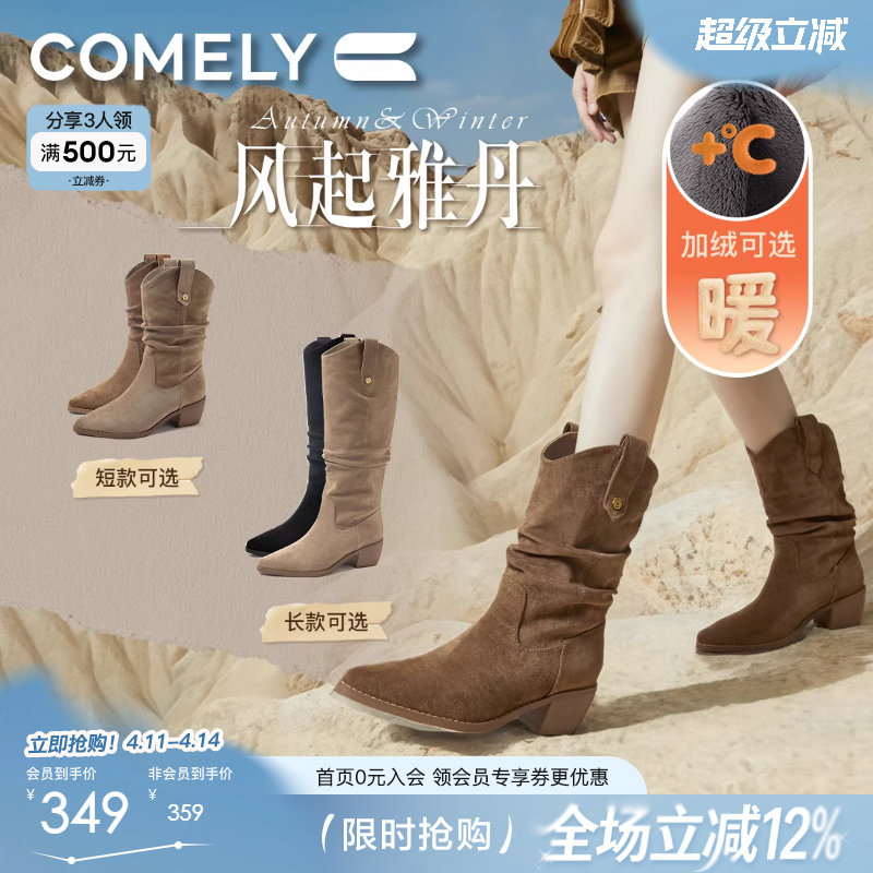 15mins复古尖头堆堆靴女2026新款秋冬加绒褶皱瘦瘦靴美拉德西部靴