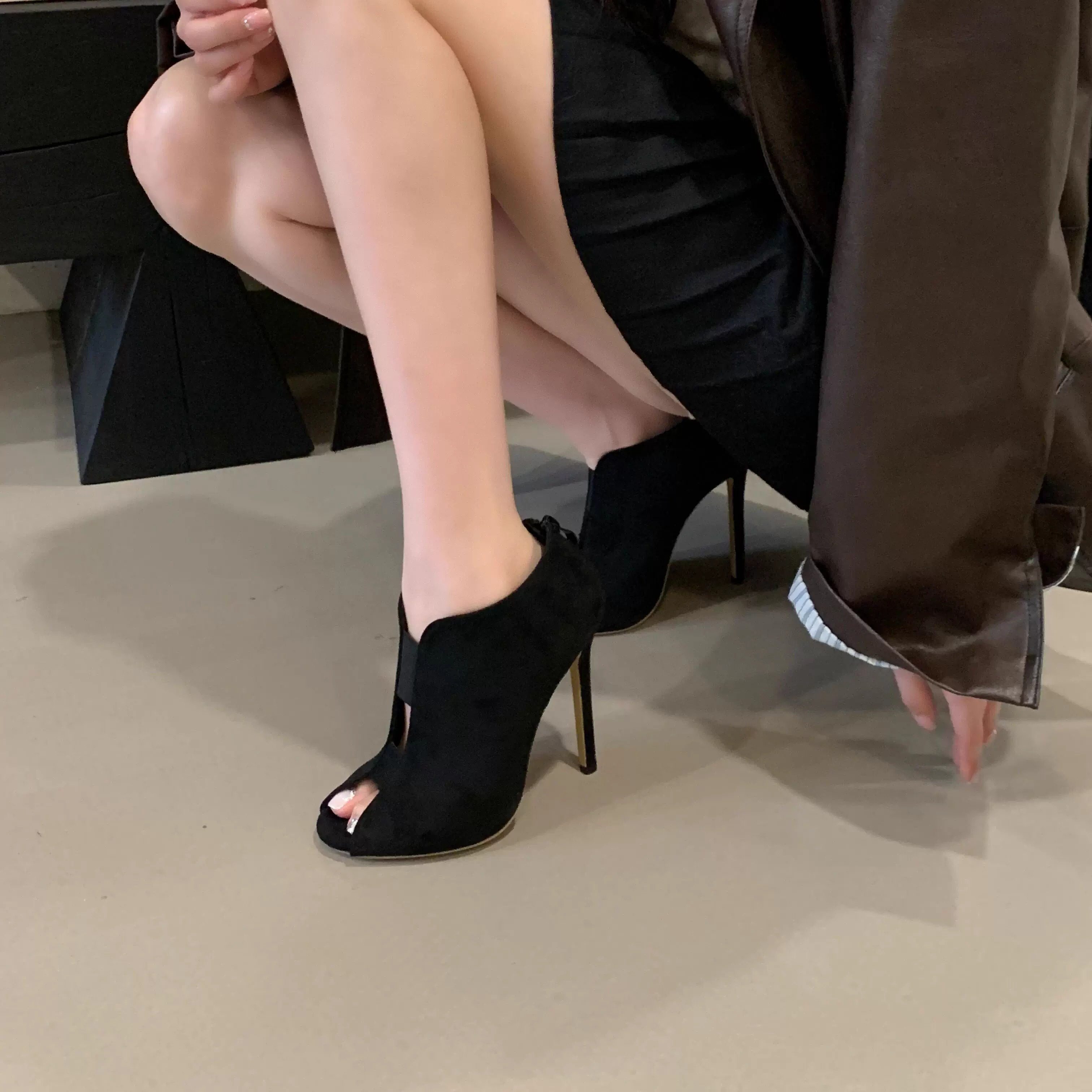欧美新款时尚简约细跟超高跟V口女靴尖头绒面性感夜店显瘦及裸靴
