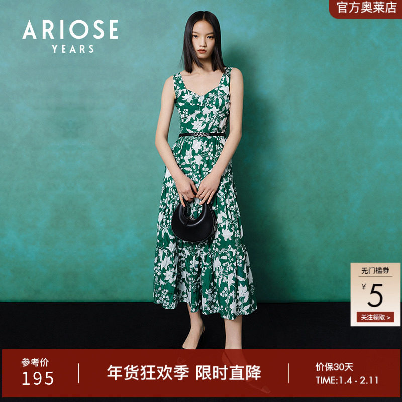 艾诺丝雅诗夏装无袖高腰优雅气质吊带印花连衣裙10619092